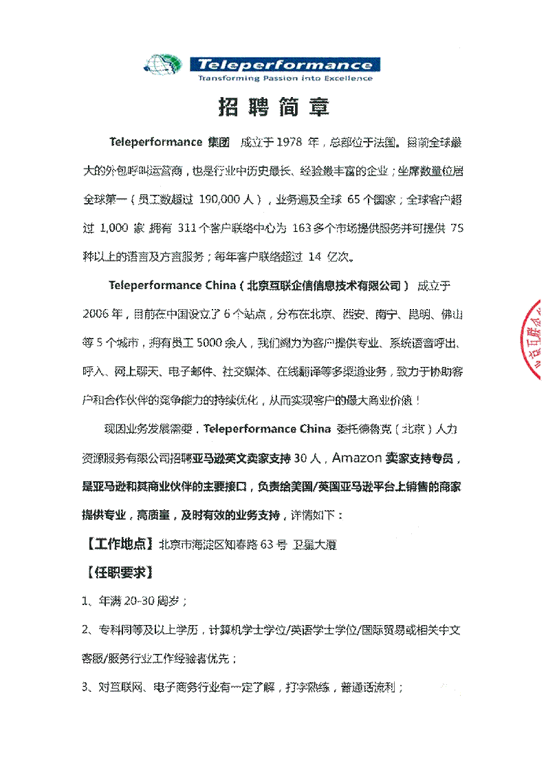 Teleperformance China(北京互联企信信息技术有限公司) 成立于2006年,目前在中国设立了6个站点,分布在北京、西安、南宁、昆明、佛山等5个城市,拥有员工5000余人,我们竭力为客户提供专业、系统语音呼出、呼入、网上聊天、电子邮件、社交媒体、在线翻译等多渠道业务,致力于协助客户和合作伙伴的竞争能力的持续优化,从而实现客户的最大商业价值!